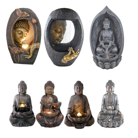 Fontana d'acqua Buddha da meditazione per interni ed esterni in resina con luce a Led e luce solare disponibile